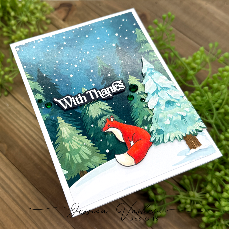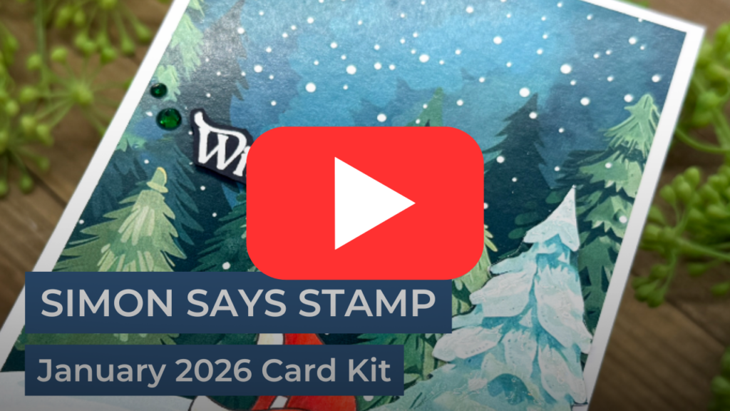 This card features winter-themed patterned paper from the Simon Says Stamp January 2026 Card Kit, with a sweet fox stamped and colored using alcohol markers and colored pencils for added depth. One of the trees was even cut from a leftover trimmed piece—no scraps wasted 🦊✨